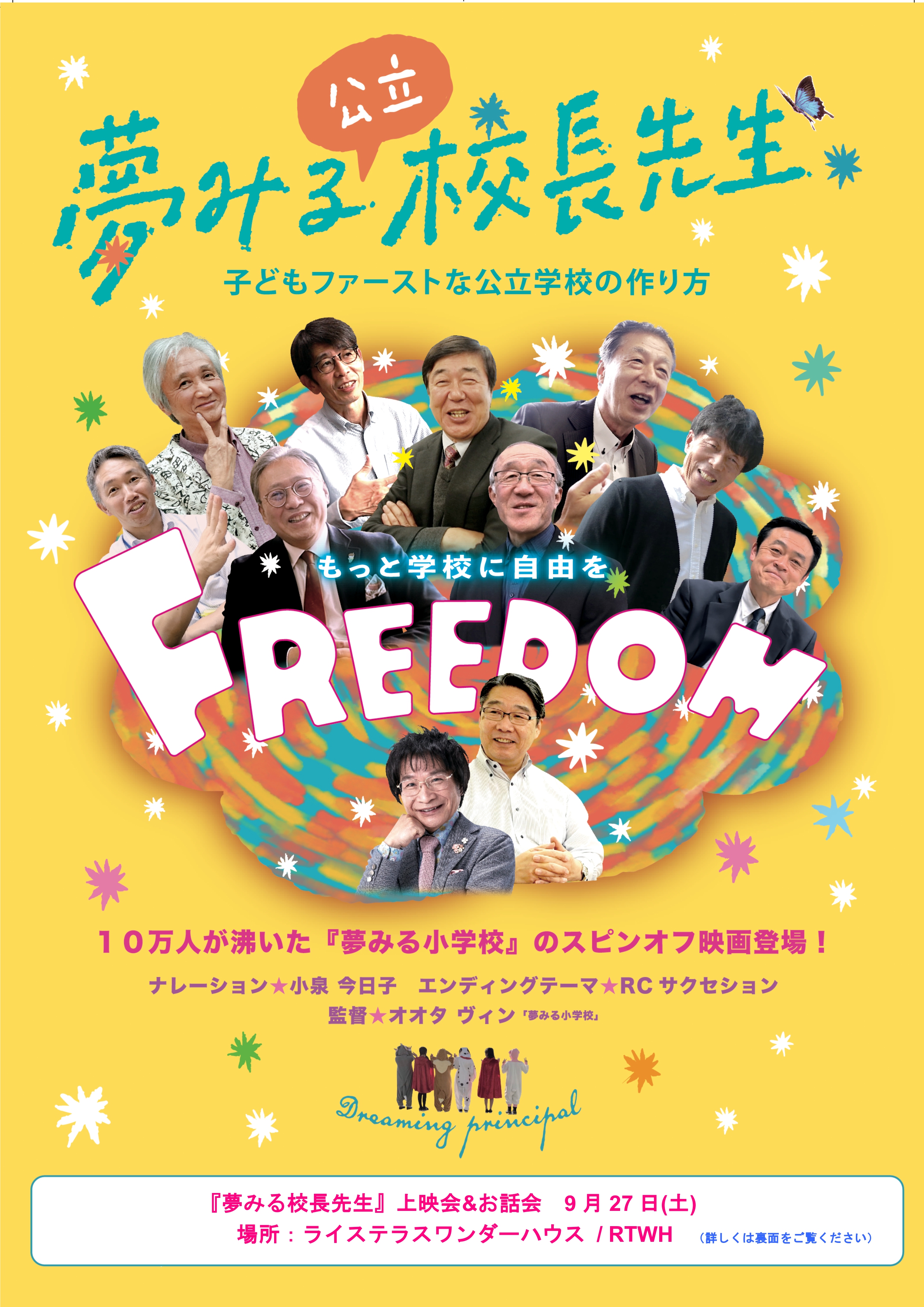 公立学校でもここまでできる!自由な校風で子どもたちの成長を育む公立小学校を記録したドキュメンタリー「夢みる校長先生」の自主上映会を開催致します。